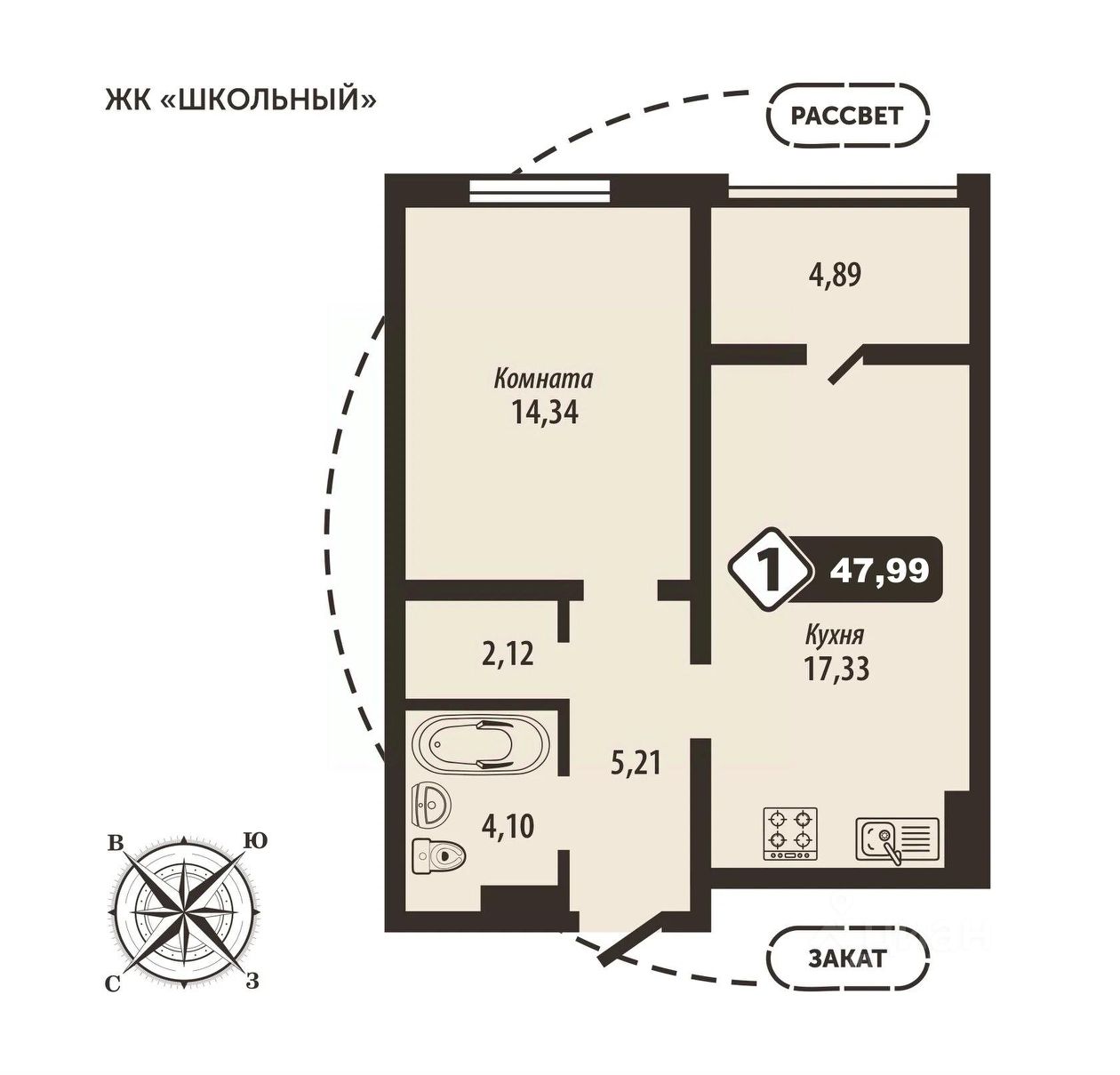 Продаётся 1-комнатная квартира в строящемся доме (Позиция 3), срок сдачи: IV-кв. 2027, общей площадью 47.99 кв.м., на 13 этаже.