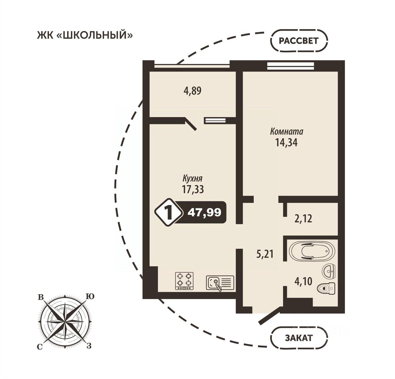 Продаётся 1-комнатная квартира в строящемся доме (Позиция 3), срок сдачи: IV-кв. 2027, общей площадью 47.99 кв.м., на 9 этаже.