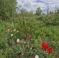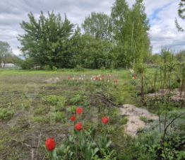 Имеются плодово-ягодные насаждения: малина, смородина, крыжовник, яблони и др., а также цветы: пионы, тюльпаны, подснежники...