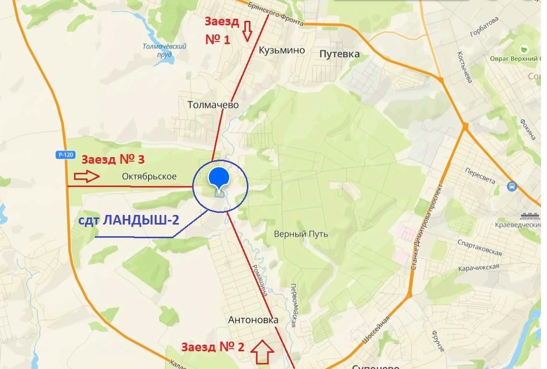 В садовое общество можно заехать с 3-х сторон: с трассы Р-120 (через село Октябрьское), через Антоновку (со стороны п. Супонево) и через п. Кузьмино- п.Толмачево.