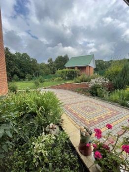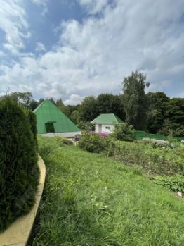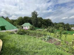 Участок площадью 37 соток имеет ровный ландшафт, на котором расположены теплицы, сарай и отдельно стоящая баня. Также имеется встроенный гараж площадью 35 квадратных метров, над которым можно обустроить зимний сад или детскую игровую комнату.