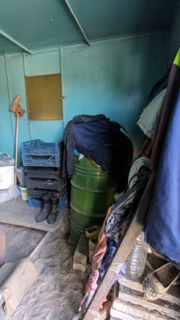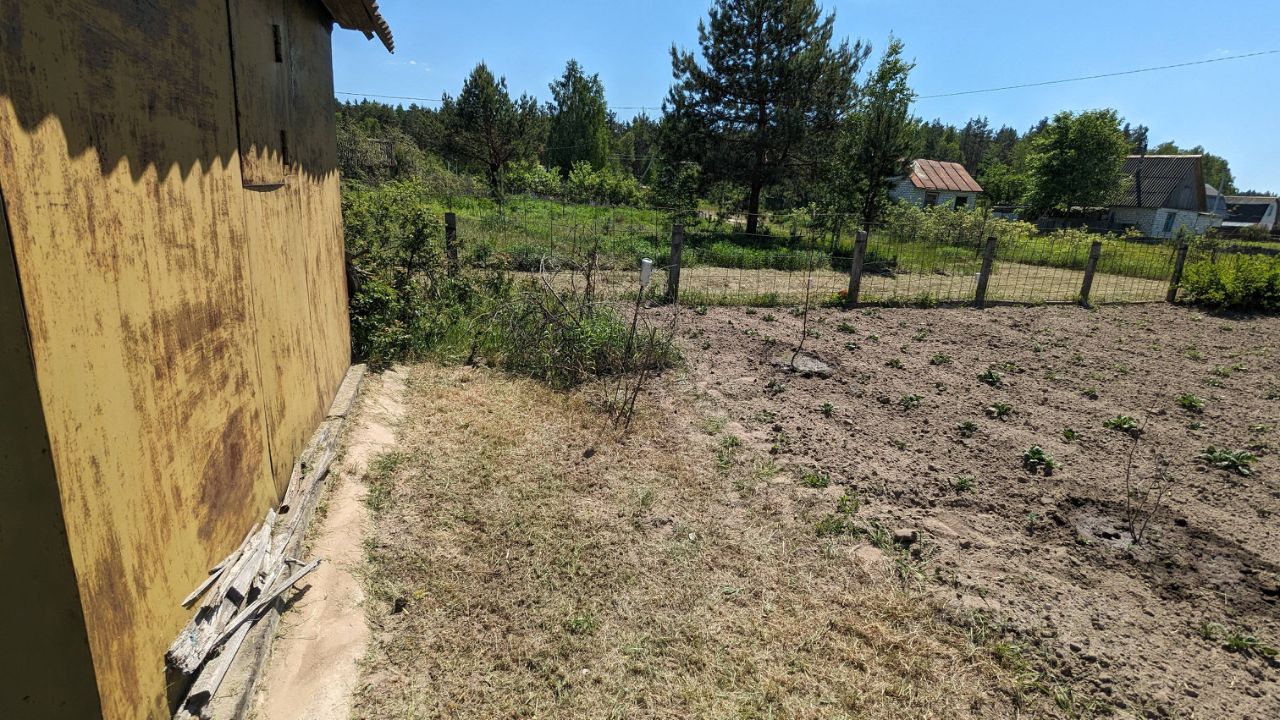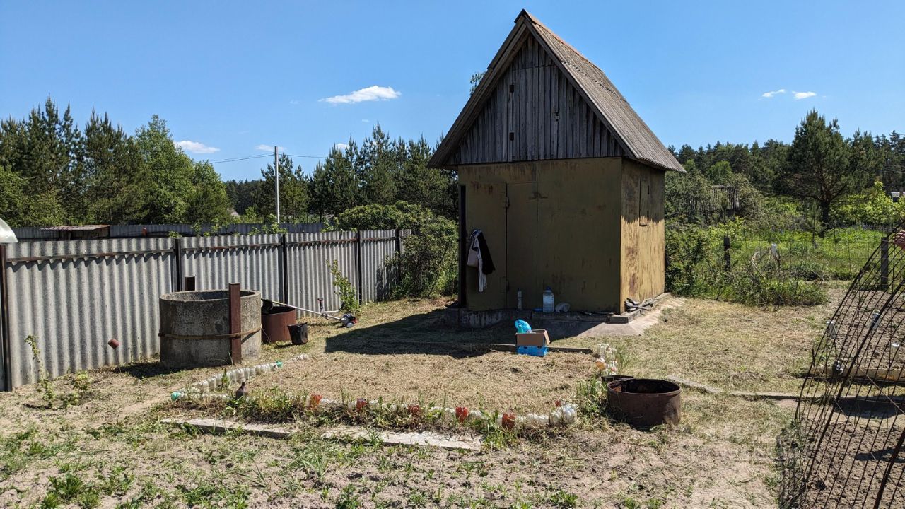 Участок 6 соток, земля ухоженная, плодородная. Есть колодец 6 колец, вода чистая. Электричество можно провести, рядом линия. Дом металлический с чердаком и обустроенным теплым погребом, две металлические лестницы. Подъезд от асфальтированной дороги 5 минут, дорога хорошая вдоль леса.