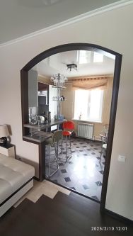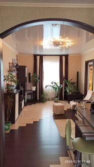 Остаётся основная часть мебели (кухня с газовой варочной панелью, диван и стенка в гостиной, двухспальная кровать в комнате на втором этаже, шкаф-купе в тамбуре), шторы, люстры.